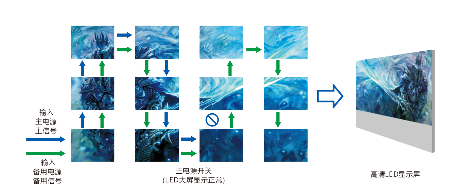 发生故障的时候,另一路信号自动介入,保证显示屏正常工作。